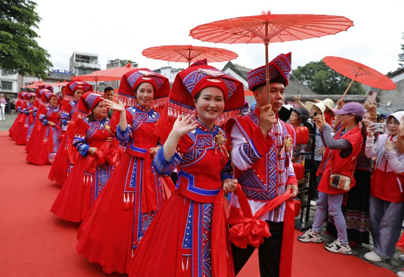 忻城县在莫土司衙署景区举行“崇德尚俭为爱减负 移风易俗倡树新风”集体婚礼,引导年轻人树立婚事新办、喜事简办的移风易俗新观念。樊绍光 摄