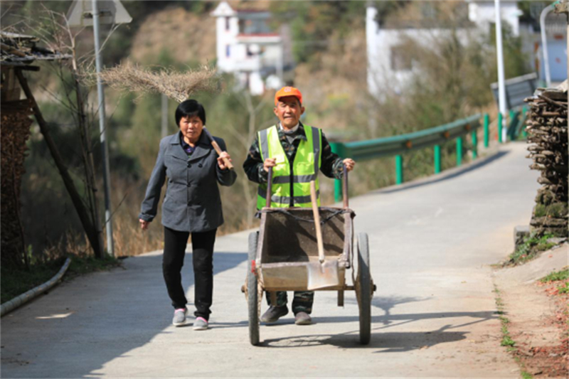 每天天刚亮,王诗进就身着橘黄色护路服,扛起铁锹,握着扫帚出门了。身后,老伴王运仙推着独轮车,步步紧跟。一个铲石,一个推车,沿路清理石子、杂草,风雨无阻。他始终坚持着自己定下的工作标准:天气好坏一个样,白天晚上一个样,身体好和不太好一个样。