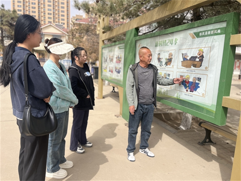 甲尔坝村村民王大爷指着甲尔坝村移风易俗广场上“新时代24孝”等各类漫画绘图赞不绝口。图片来源:内蒙古自治区包头市昆都仑区文明办