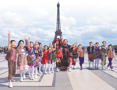 五指山黎苗童声合唱团在巴黎埃菲尔铁塔前留影。五指山市委宣传部供图